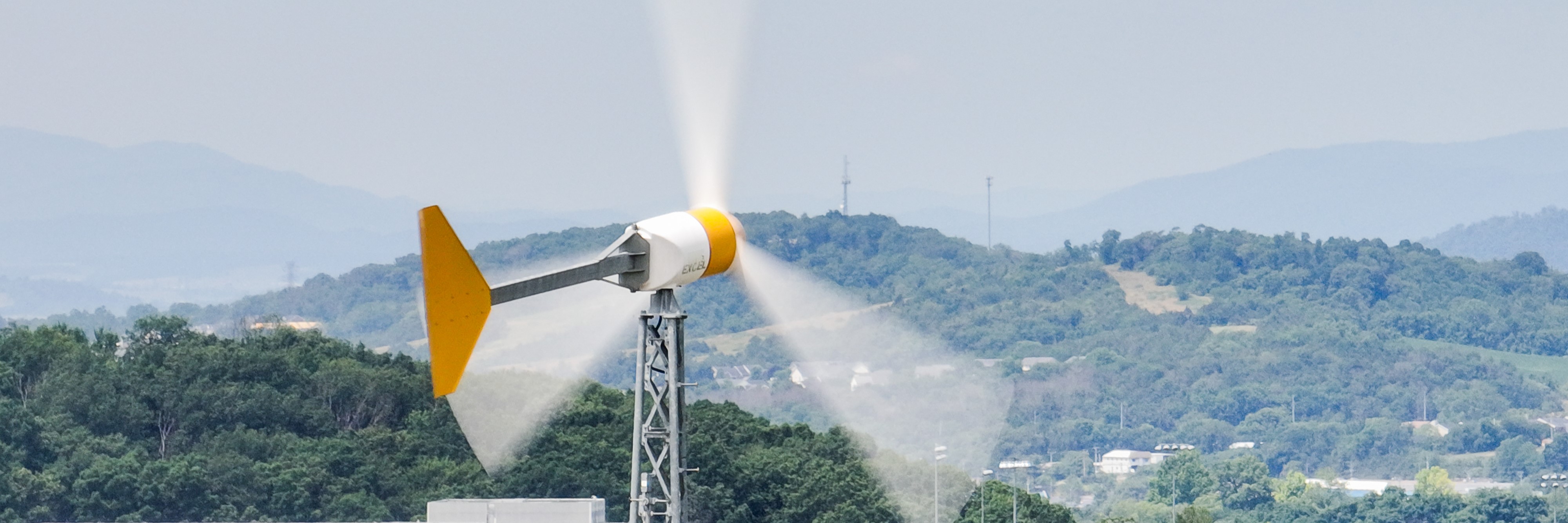 The Center for the Advancement of Sustainable Energy (CASE) at JMU is proud to offer tours of the university’s on-campus wind turbine training facility, a unique resource for professors across various disciplines. The Small Wind Turbine Training facility is composed of a 7500 watt wind turbine, a 750 watt solar array, and a demonstration building with storage.