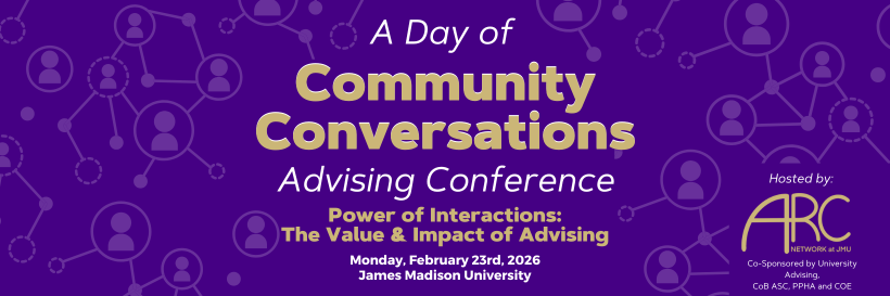 All JMU faculty and staff who serve in an advising function are invited to attend the Day of Community Conversations advising conference at JMU on Monday, February 23rd, 2026 in the Festival Conference Center. The theme this coming year will be “Power of Interactions: The Value & Impact of Advising.” This development opportunity is hosted by the ARC Network and co-sponsored by University Advising, CFI, JMU Libraries, the College of Education, and the Academic Success Center in the College of Business. We hope to see you all in February!