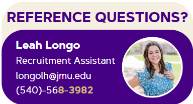 Reach out to Leah Longo, Recruitment and Employment Services Assistant, at jobs@jmu.edu or (540)-568-3982.