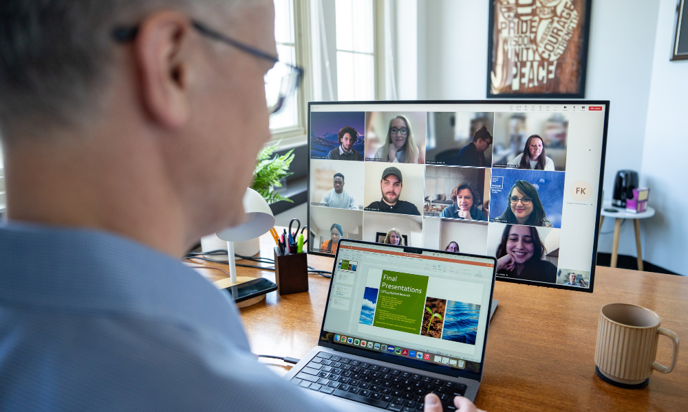 Driven by the goal of improving his skill set within his accelerating career, Matthew Johnson is a graduate student in the Master’s in Business Administration (MBA) program with a concentration in Executive Leadership. This program is given in a hybrid format, which takes place synchronously every Tuesday and in-person once every 8 weeks for a full Saturday. Johnson explained that he was drawn to the program after deciding to further his skillset through graduate school and was looking for a program that both met his professional goals and wasn’t lacking in creating connections, “what drew me to the program specifically, is that you’re covering every element of what you would probably face, from a decision, strategy, and execution standpoint for any business executive. I had an itch to go back and study business to do better in my current role and it felt like going into the executive MBA route felt right, but after looking around [for a program] I learned quickly that I didn’t want an asynchronous program.” Johnson wasn’t alone in realizing that he wanted to avoid an asynchronous format.