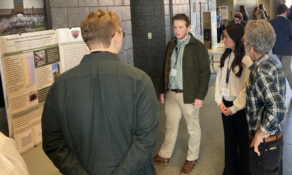 Dr. Ehren Moler, Assistant Professor in the Integrated Science and Technology Program and faculty advisor for a project on the effect of biochar amendment in large-scale outdoor tree seedling production, noted, “My students felt honored to share results from their ISAT capstone project at the 2026 Environment Virginia Symposium. Their capstone project is in partnership with the Virginia Department of Forestry, which fits the applied science them of the Symposium, where researchers and environmental managers from across the Commonwealth share progress toward greater environmental wellbeing.”