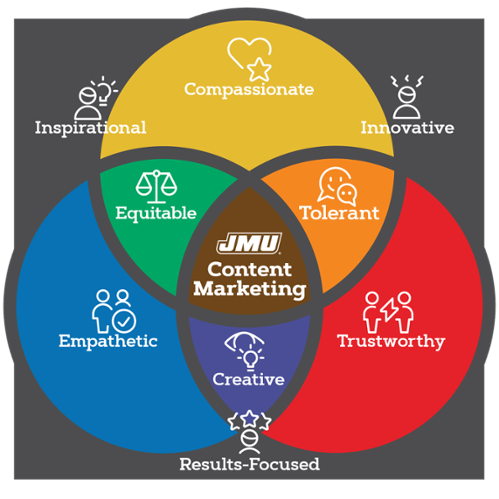 We create and optimize content that publicly positions JMU as superior and unique, elevates awareness of JMU nationally, recruits students and their families, engages alumni, supports fundraising, helps fulfill campaign goals and priorities, and achieves high-level storytelling in support of the JMU brand.
